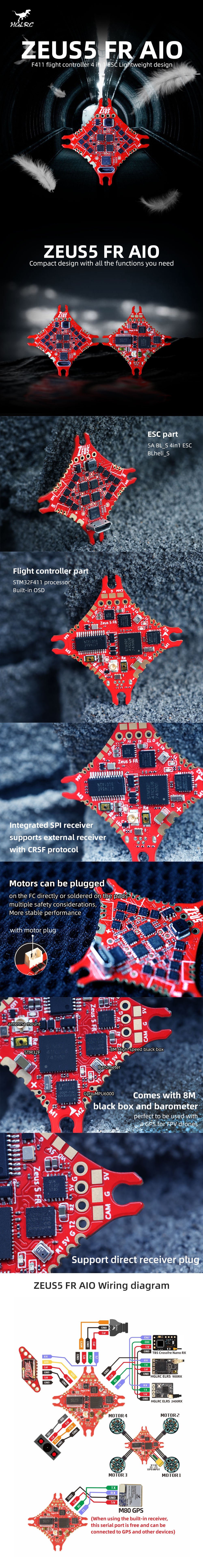 HGLRC Zeus5 FR AIO 1-2S F411 Flight Controller 5A BL_S 4in1 ESC Frsky SPI RX